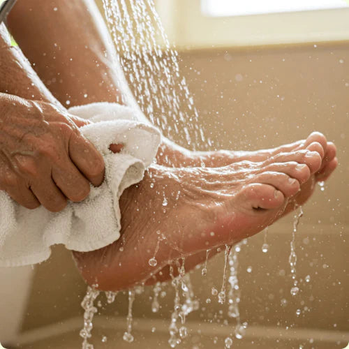 Lava y seca cuidadosamente tus pies, insistiendo en las zonas entre los dedos, donde los hongos proliferan.
