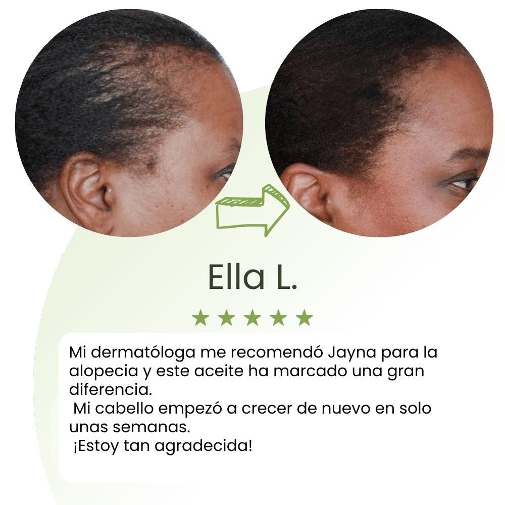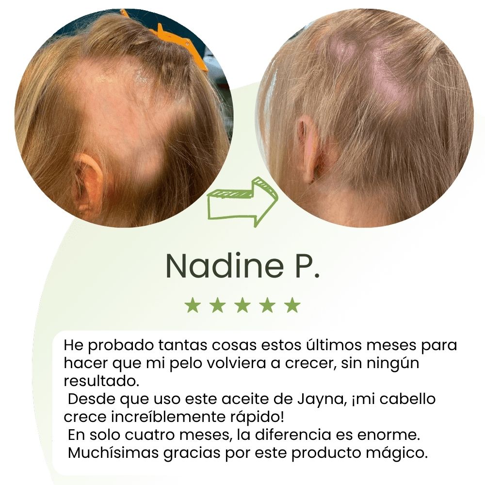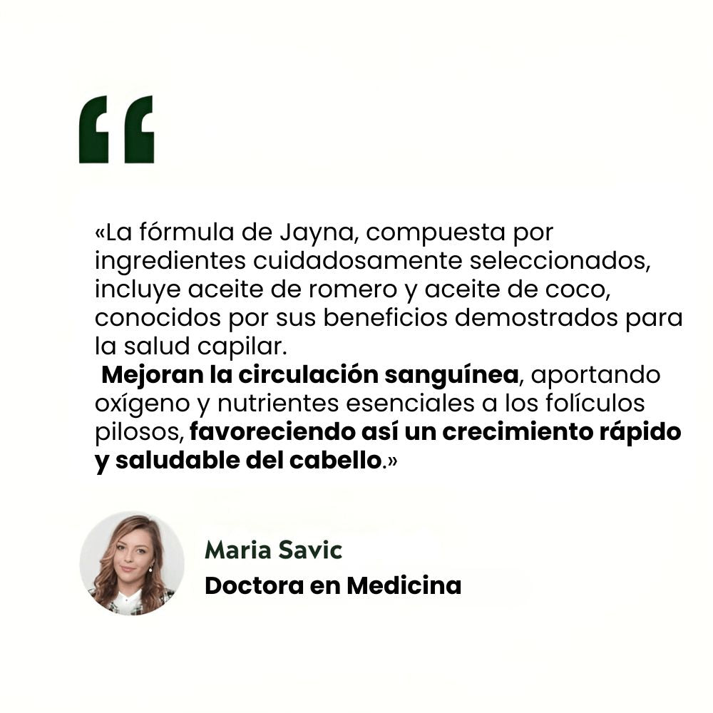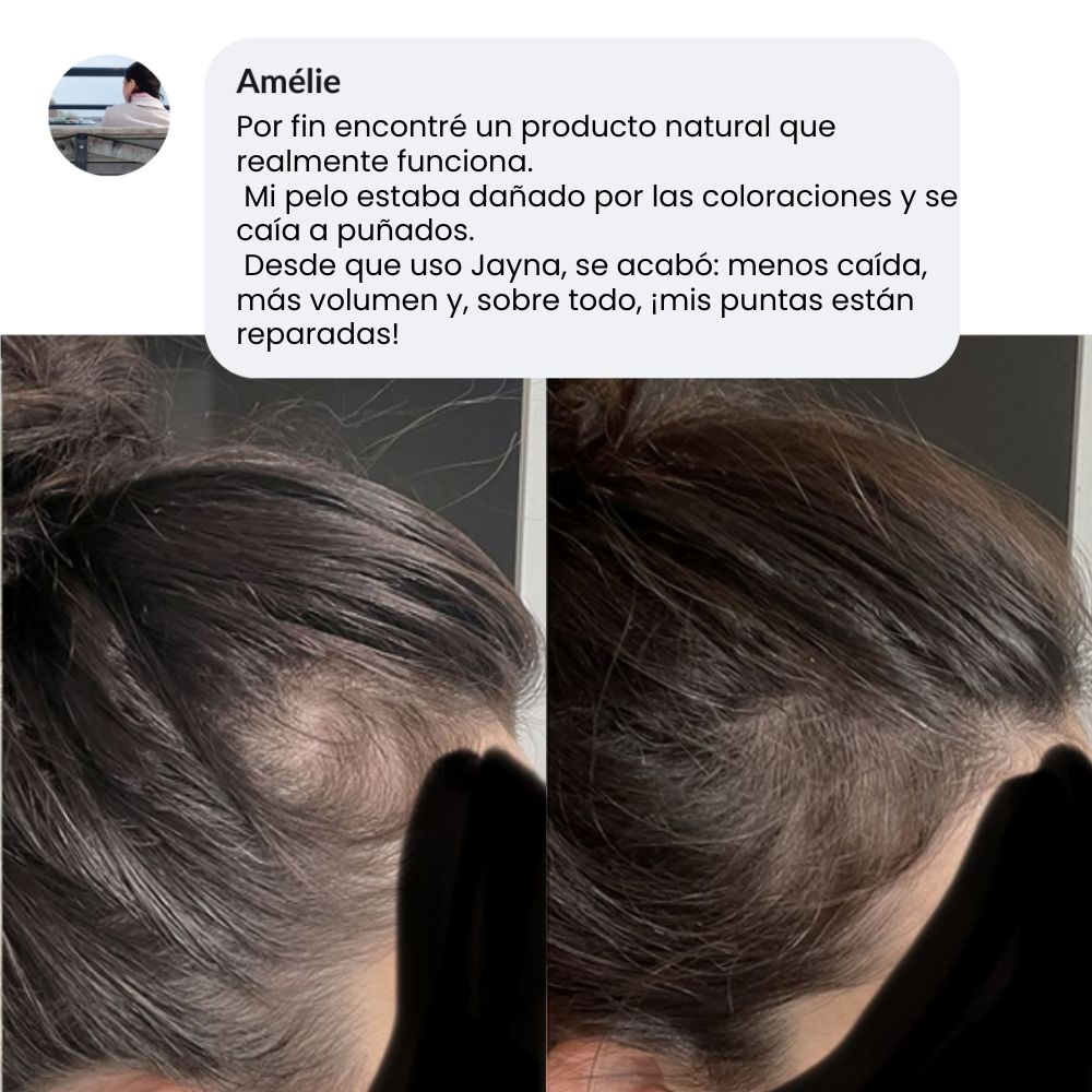 Empecé a notar muchas zonas claras por la menopausia y estaba desesperada. Desde que aplico el sérum de Jayna tres veces por semana, mi pelo se ve más fuerte, brillante y ya no encuentro tantos cabellos en el cepillo. Lo he recomendado a mis amigas.